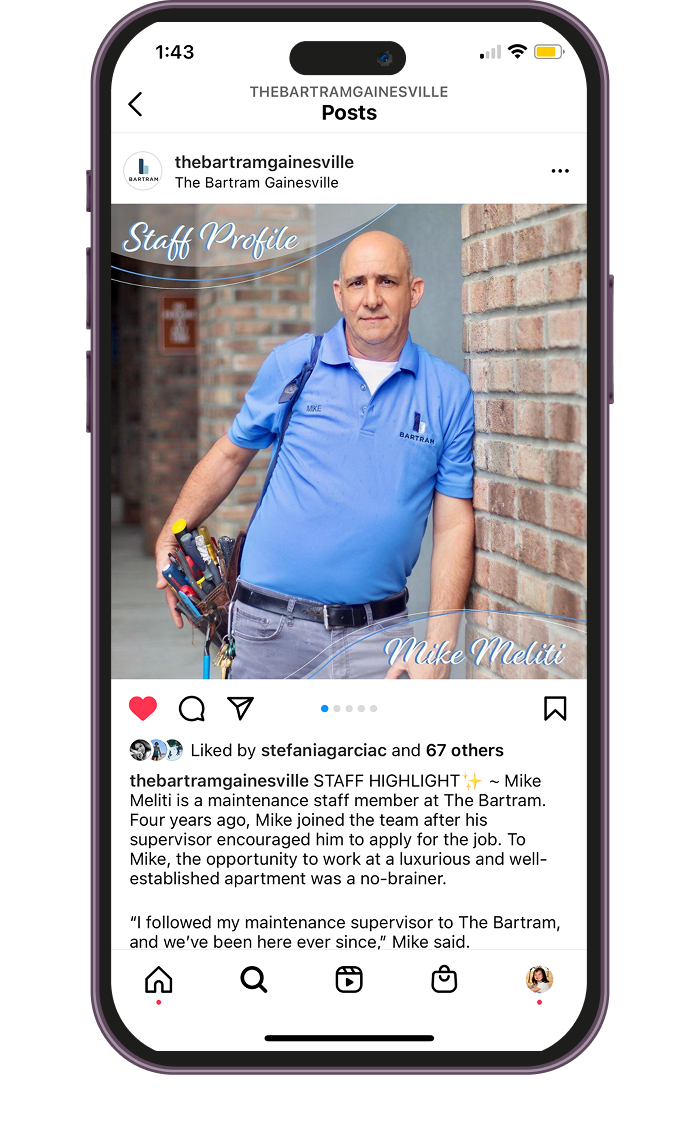 To combat this challenge, we devised a cohesive, purpose-driven strategy that expanded The Bartram beyond the normal confines of an apartment complex. Using our research on the industry and young professionals who are interested in apartment living, we determined the best ways for this client to connect with all relevant audiences. These ways included creating partnerships with local businesses, highlighting amenities through up-scale production shoots and reinforcing a sense of community through resident and staff highlights. We even created content surrounding wellness and local finds.
